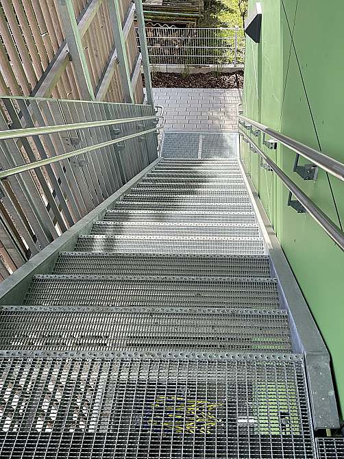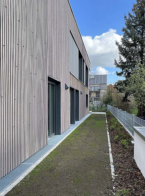 Der Neubau wurde mit Wänden in klassischer Holzrahmenbauweise mit Holzfaser-Einblasdämmung und massiven Brettsperrholzdecken (CLT) errichtet. Die Fassaden sind als Lückenschalung aus vorvergrauten Weißtanne-Leisten erstellt. An einzelnen Akzentstellen wurden grün beschichtete Fassadenplatten verwendet.