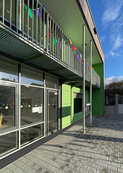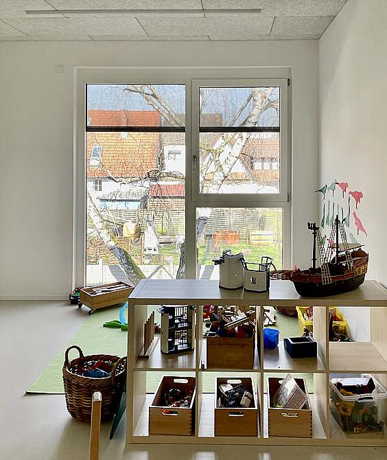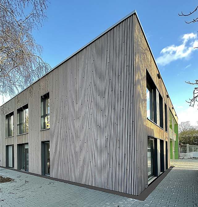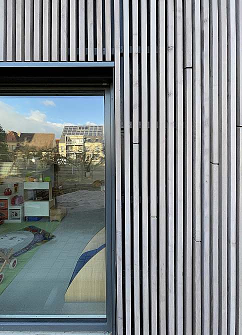 Klimaschutz stand beim Bau dieser Kindertagesstätte ganz weit oben auf der Agenda, deshalb wurde für die gesamte Konstruktion ab Oberkante der Bodenplatte der Baustoff Holz verwendet.