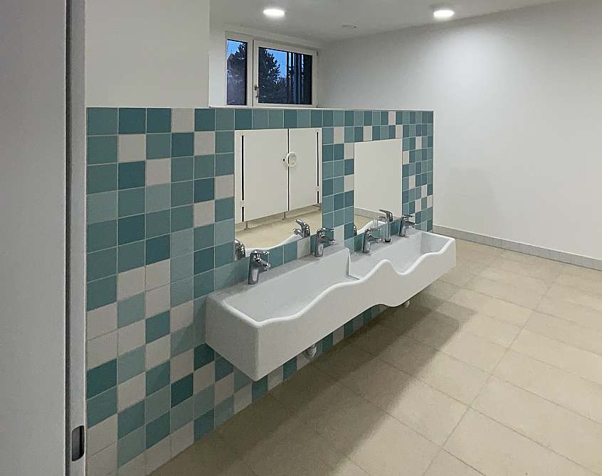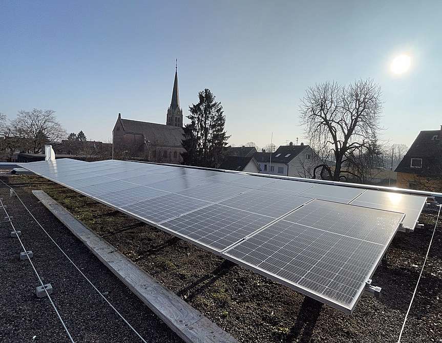 Auf dem Flachdach steht eine Photovoltaikanlage, die den Stromverbrauch der Einrichtung deutlich reduziert.